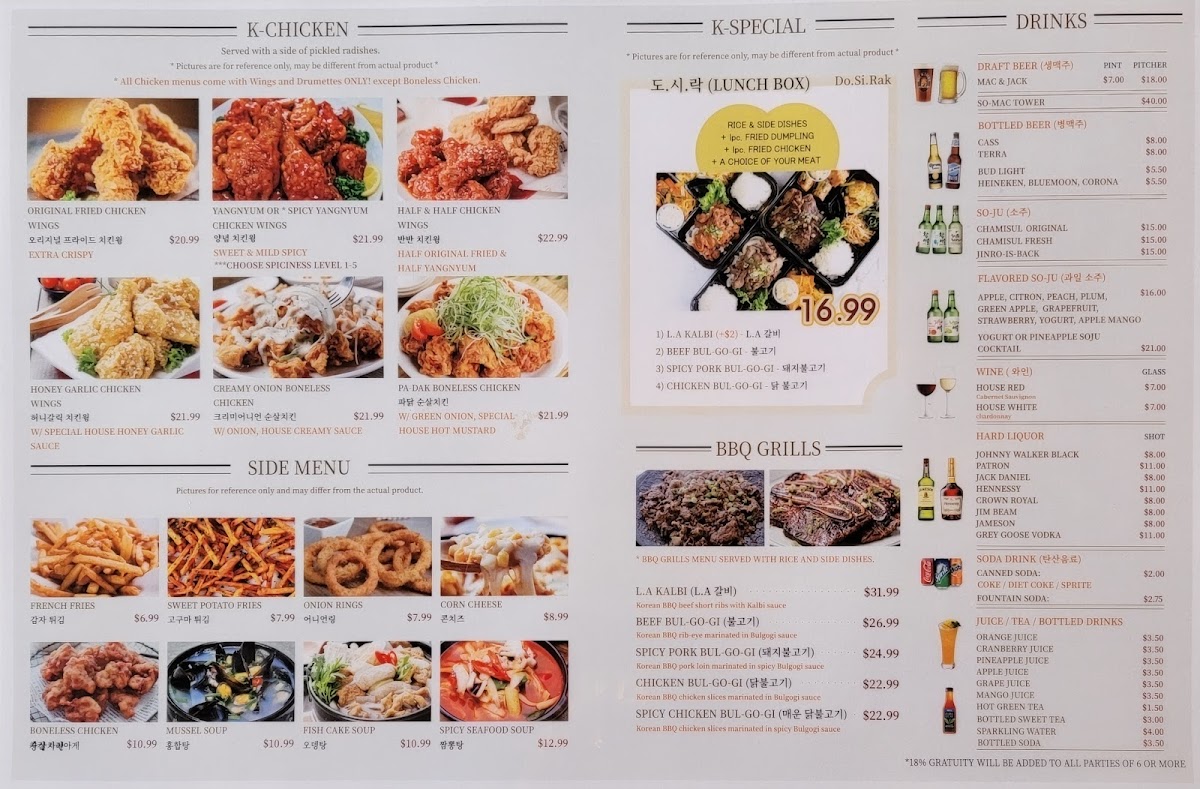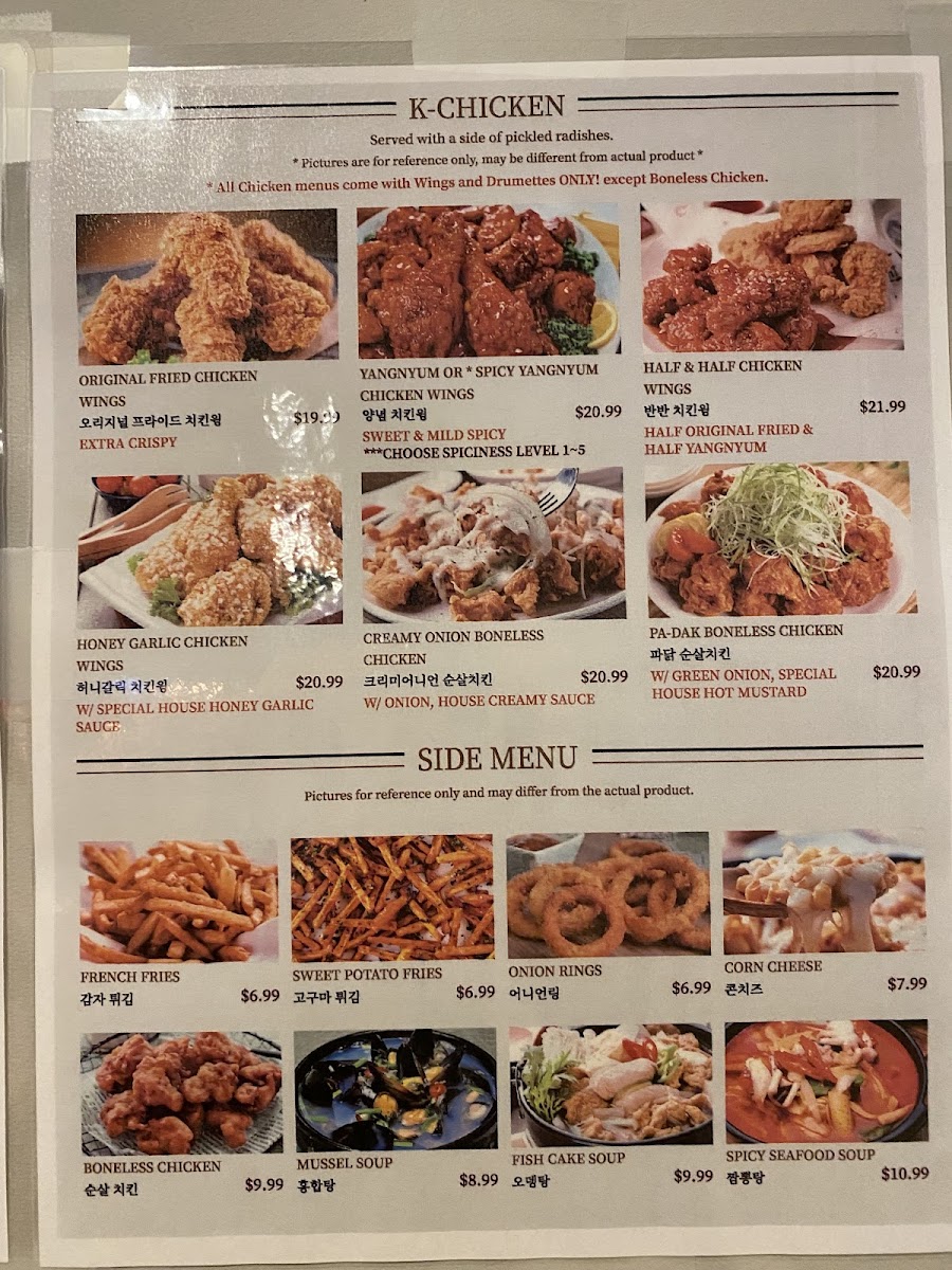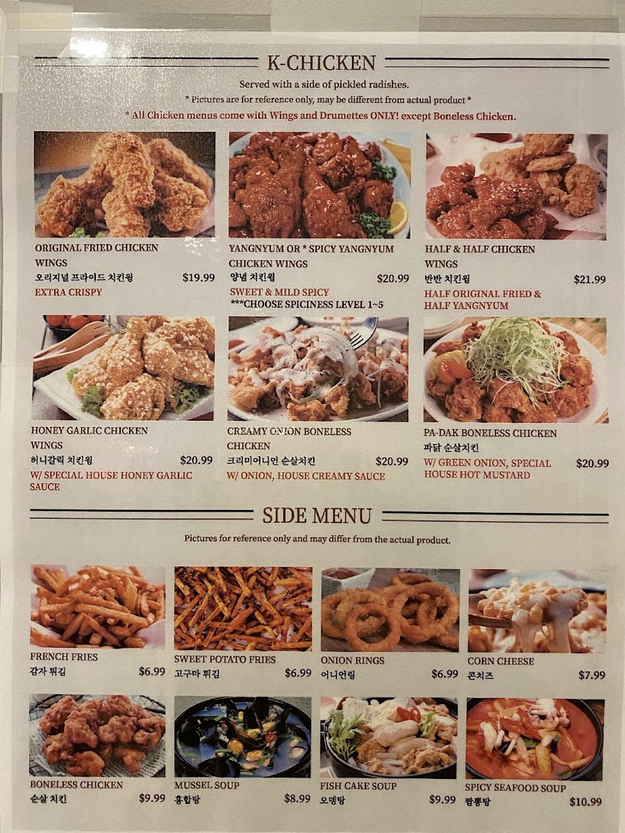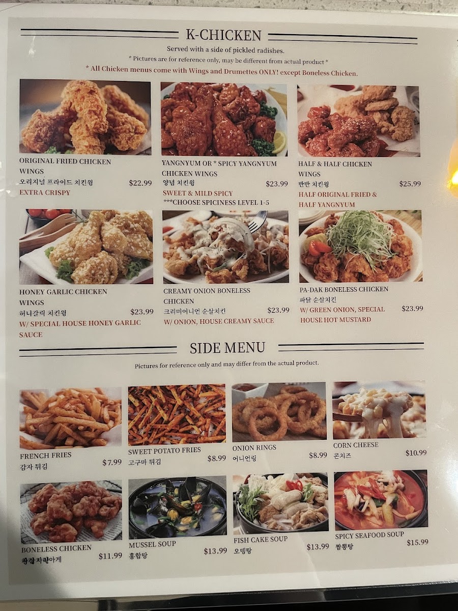 The menu’s approachable nature fits well with the restaurant’s unpretentious atmosphere, inviting diners to enjoy Korean cuisine in a straightforward, welcoming setting. Whether ordering to share over a satisfying meal or grabbing a quick and flavorful fried chicken takeaway, the dishes here reflect a pleasant balance of familiar tastes and casual enjoyment.